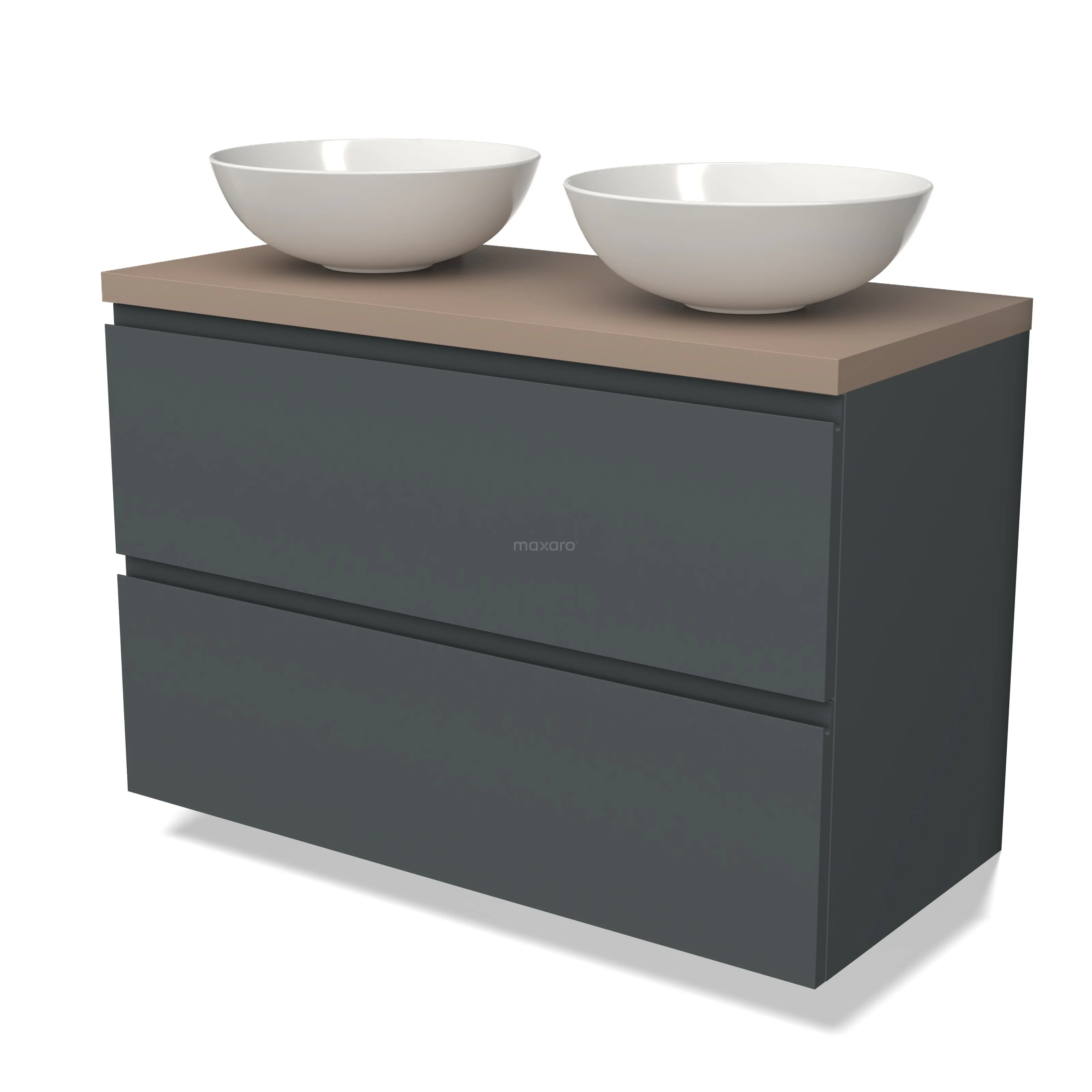 Modulo Plato Badmöbel mit Aufsatzwaschbecken | 100 cm Dunkelgrau Grifflos front Taupe blatt 2 übereinanderliegende Schubladen