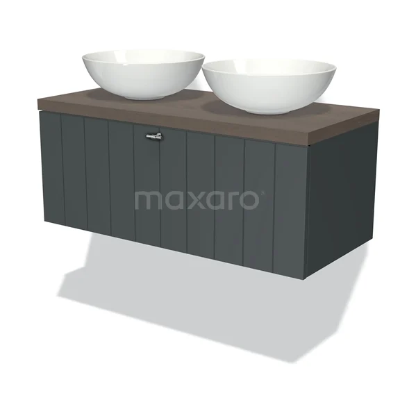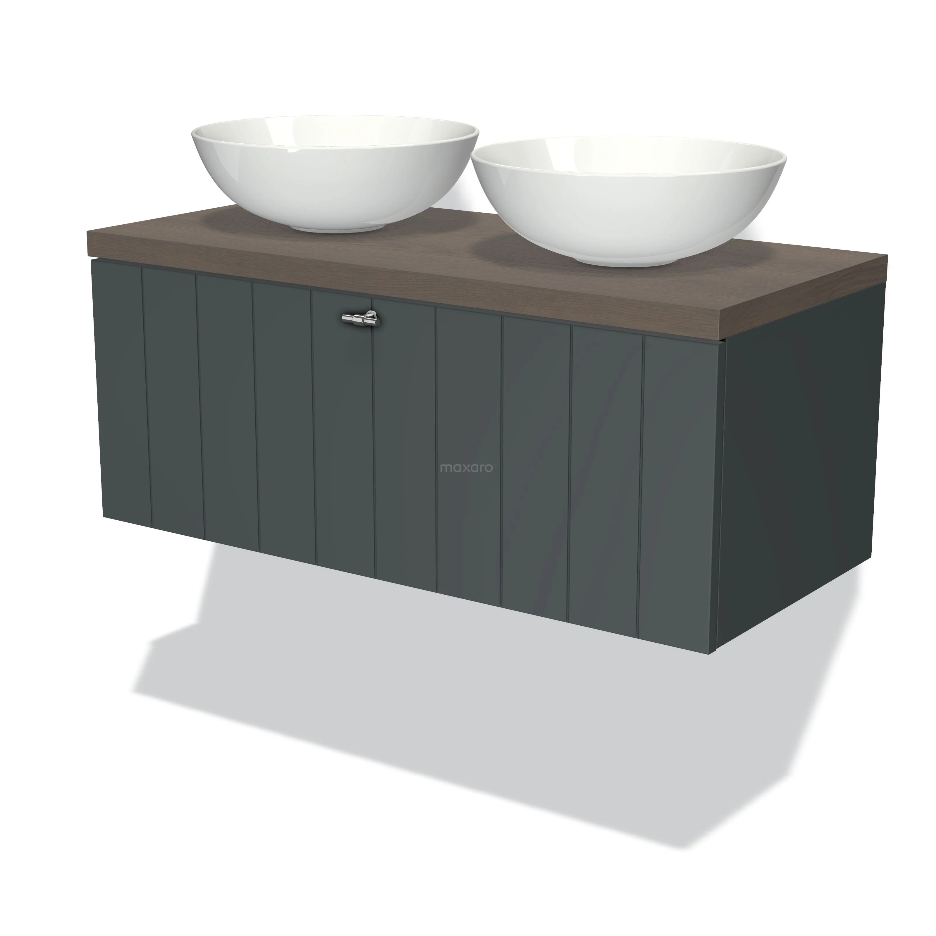Modulo Plato Badmöbel mit Aufsatzwaschbecken | 100 cm Dunkelgrau Lamelle front Dunkelbraune Eiche blatt 1 Schublade