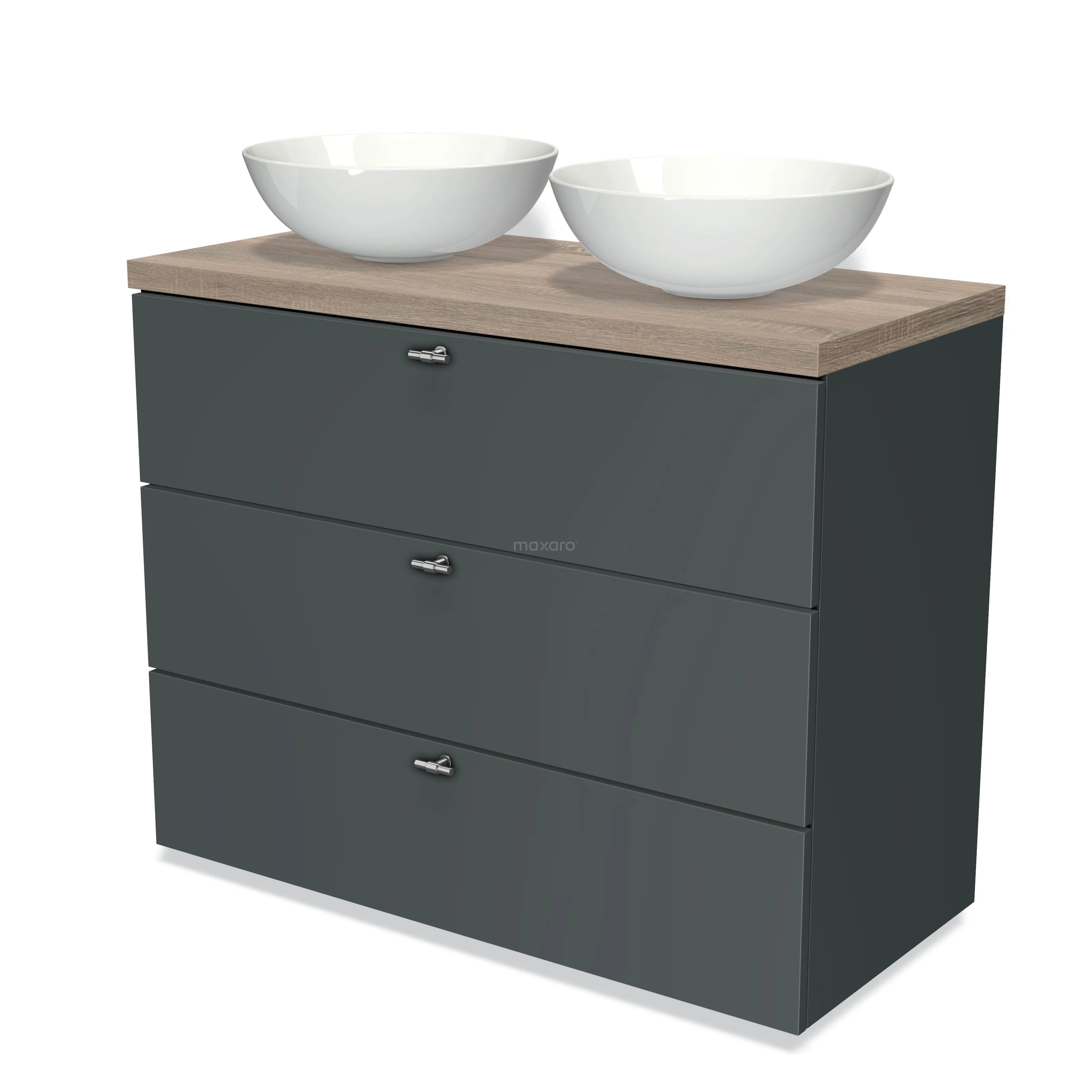 Modulo Plato Badmöbel mit Aufsatzwaschbecken | 100 cm Dunkelgrau Lamelle front Eiche blatt 3 Schubladen