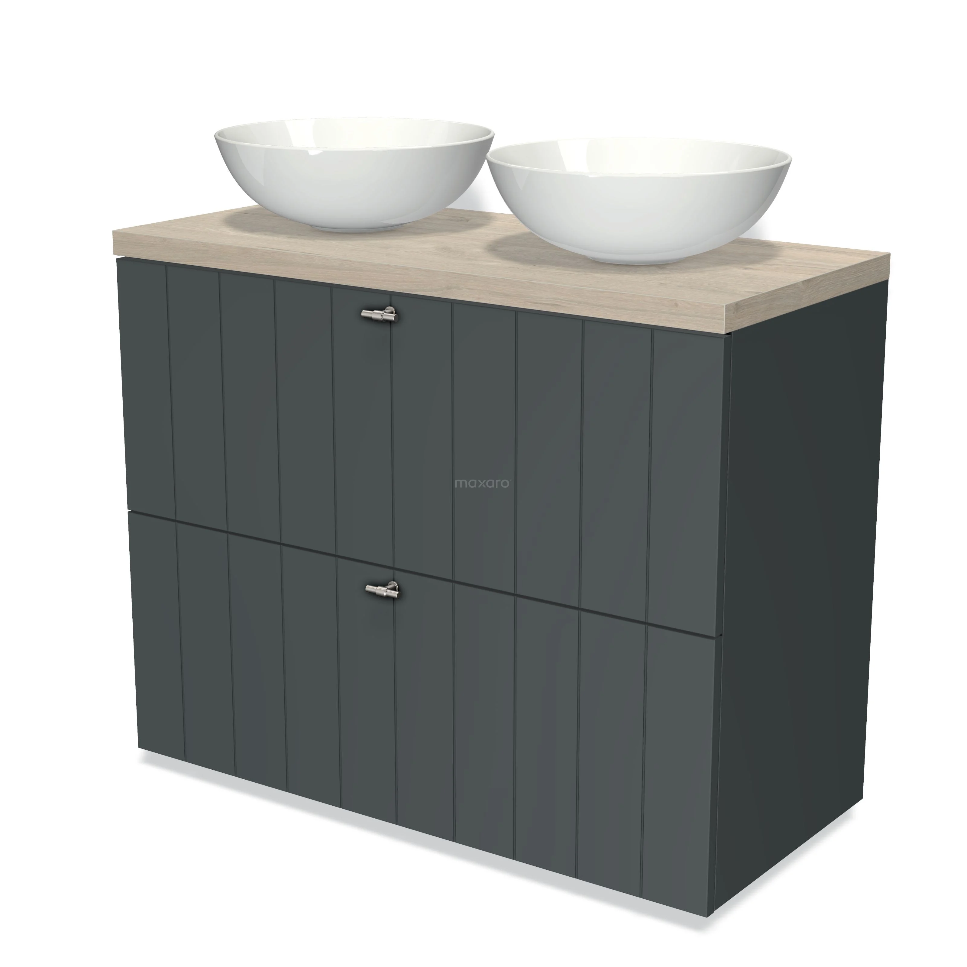 Modulo Plato Badmöbel mit Aufsatzwaschbecken | 100 cm Dunkelgrau Lamelle front Hellgraue Eiche blatt 2 hohe Schubladen übereinanderliegend