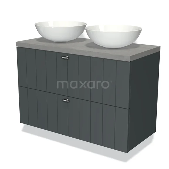 Modulo Plato Badmöbel mit Aufsatzwaschbecken | 100 cm Dunkelgrau Lamelle front Hellgrauer Beton blatt 2 übereinanderliegende Schubladen