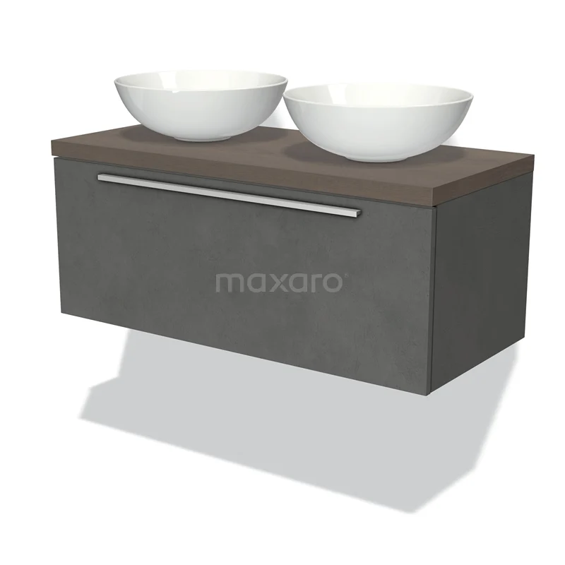 Modulo Plato Badmöbel mit Aufsatzwaschbecken | 100 cm Dunkelgrauer Beton Flach front Dunkelbraune Eiche blatt 1 Schublade