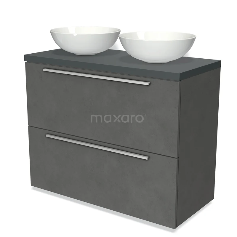 Modulo Plato Badmöbel mit Aufsatzwaschbecken | 100 cm Dunkelgrauer Beton Flach front Dunkelgrau blatt 2 hohe Schubladen übereinanderliegend