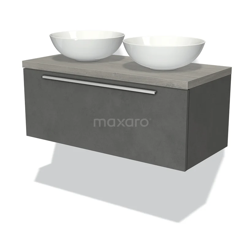 Modulo Plato Badmöbel mit Aufsatzwaschbecken | 100 cm Dunkelgrauer Beton Flach front Graue Eiche blatt 1 Schublade