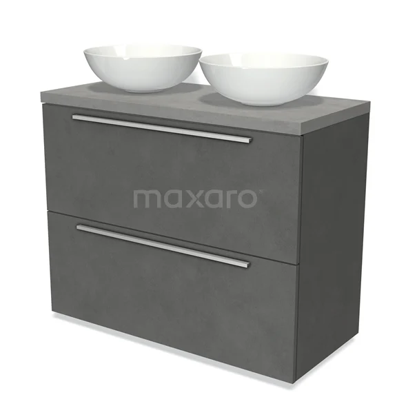 Modulo Plato Badmöbel mit Aufsatzwaschbecken | 100 cm Dunkelgrauer Beton Flach front Hellgrauer Beton blatt 2 hohe Schubladen übereinanderliegend
