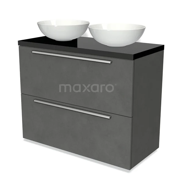 Modulo Plato Badmöbel mit Aufsatzwaschbecken | 100 cm Dunkelgrauer Beton Flach front Hochglanz Schwarz blatt 2 hohe Schubladen übereinanderliegend