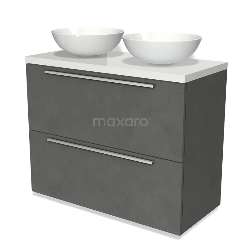 Modulo Plato Badmöbel mit Aufsatzwaschbecken | 100 cm Dunkelgrauer Beton Flach front Hochglanz Weiß blatt 2 hohe Schubladen übereinanderliegend