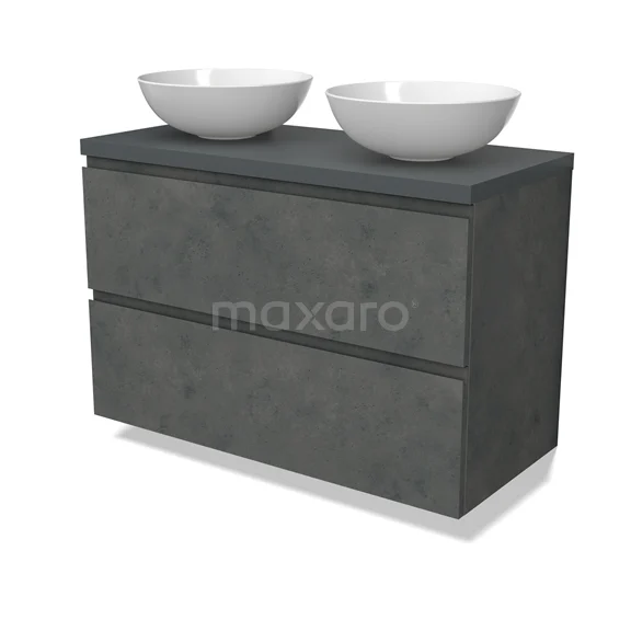 Modulo Plato Badmöbel mit Aufsatzwaschbecken | 100 cm Dunkelgrauer Beton Grifflos front Dunkelgrau blatt 2 übereinanderliegende Schubladen