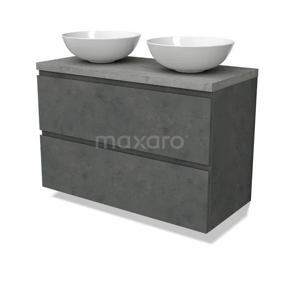 Modulo Plato Badmöbel mit Aufsatzwaschbecken | 100 cm Dunkelgrauer Beton Grifflos front Graue Eiche blatt 2 übereinanderliegende Schubladen