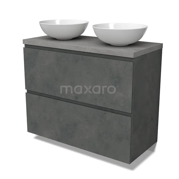 Modulo Plato Badmöbel mit Aufsatzwaschbecken | 100 cm Dunkelgrauer Beton Grifflos front Hellgrauer Beton blatt 2 hohe Schubladen übereinanderliegend