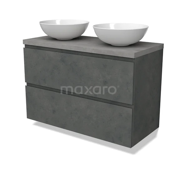 Modulo Plato Badmöbel mit Aufsatzwaschbecken | 100 cm Dunkelgrauer Beton Grifflos front Hellgrauer Beton blatt 2 übereinanderliegende Schubladen