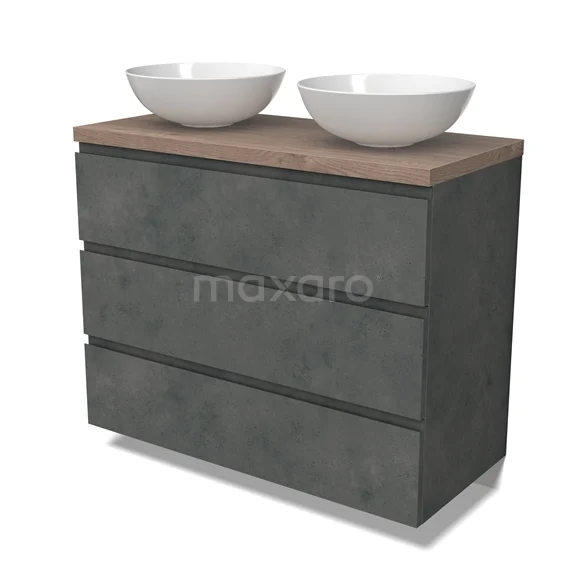 Modulo Plato Badmöbel mit Aufsatzwaschbecken | 100 cm Dunkelgrauer Beton Grifflos front Mittelbraune Eiche blatt 3 Schubladen