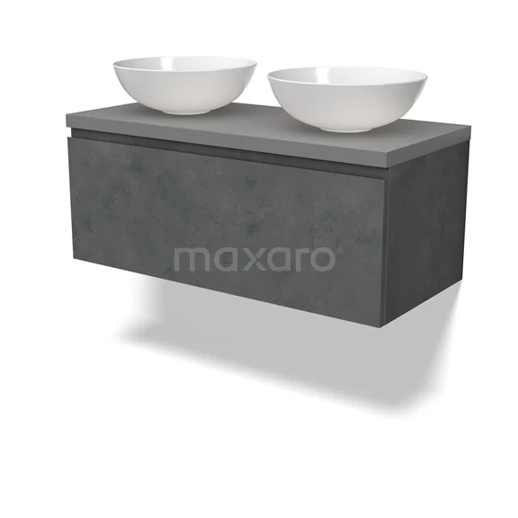 Modulo Plato Badmöbel mit Aufsatzwaschbecken | 100 cm Dunkelgrauer Beton Grifflos front Mittelgrau blatt 1 Schublade