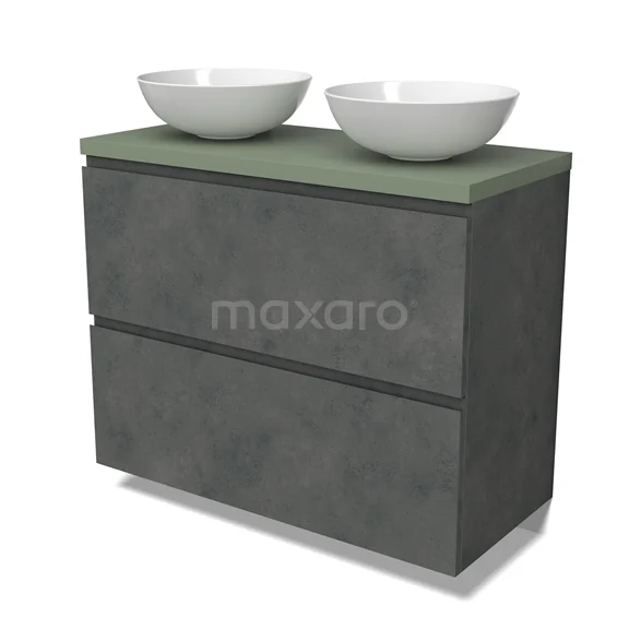 Modulo Plato Badmöbel mit Aufsatzwaschbecken | 100 cm Dunkelgrauer Beton Grifflos front Salbeigrün blatt 2 hohe Schubladen übereinanderliegend