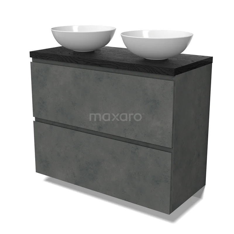 Modulo Plato Badmöbel mit Aufsatzwaschbecken | 100 cm Dunkelgrauer Beton Grifflos front Schwarze Eiche blatt 2 hohe Schubladen übereinanderliegend