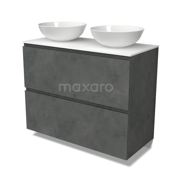 Modulo Plato Badmöbel mit Aufsatzwaschbecken | 100 cm Dunkelgrauer Beton Grifflos front Solid Surface blatt 2 hohe Schubladen übereinanderliegend