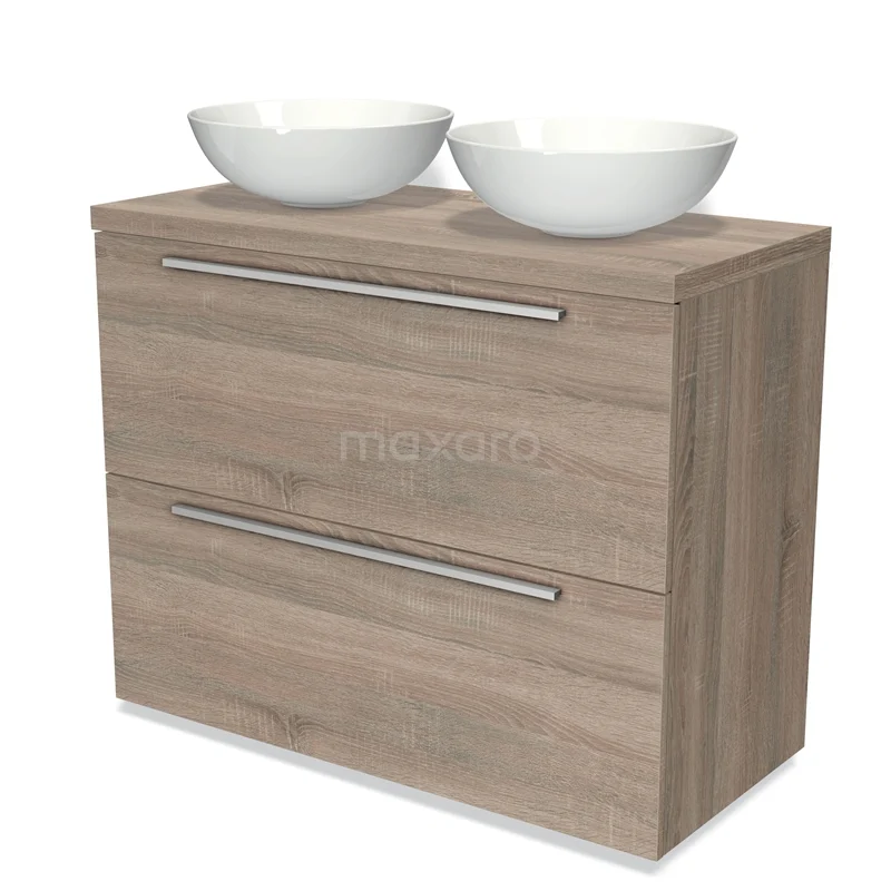Modulo Plato Badmöbel mit Aufsatzwaschbecken | 100 cm Eiche Flach front Eiche blatt 2 hohe Schubladen übereinanderliegend