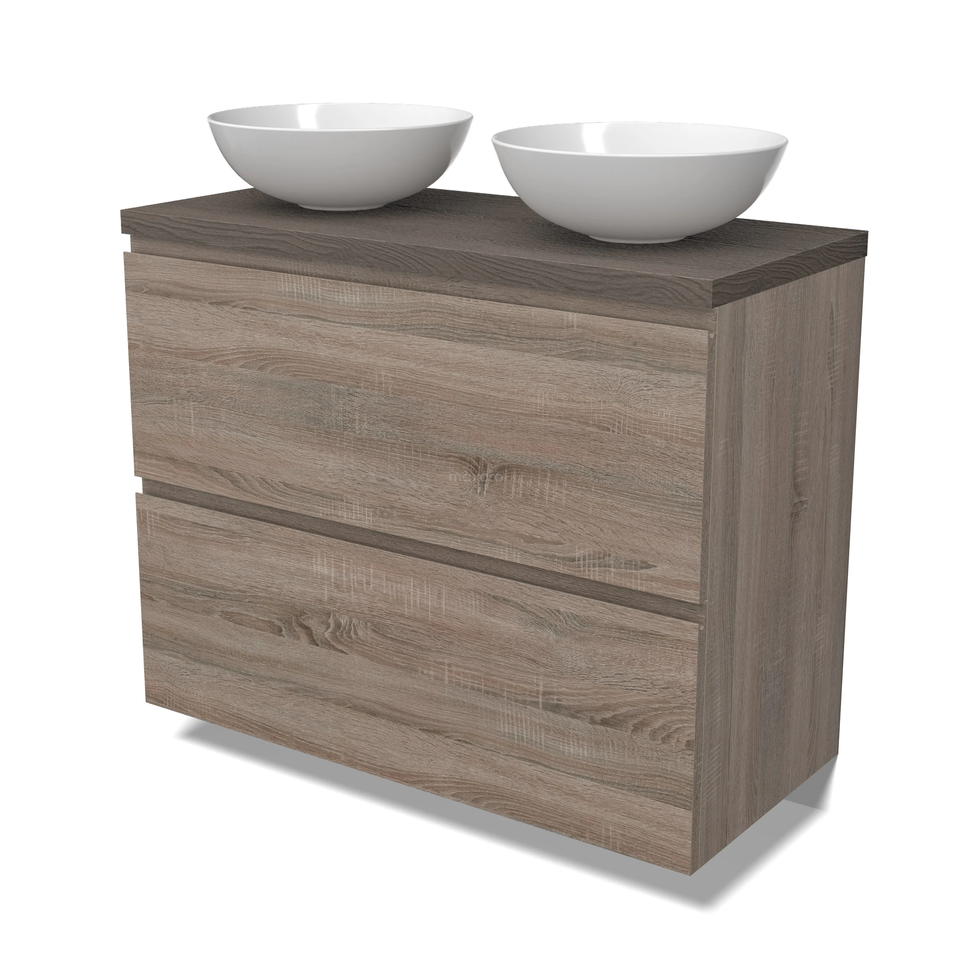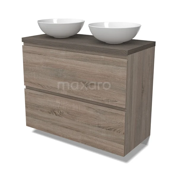 Modulo Plato Badmöbel mit Aufsatzwaschbecken | 100 cm Eiche Grifflos front Dunkelbraune Eiche blatt 2 hohe Schubladen übereinanderliegend