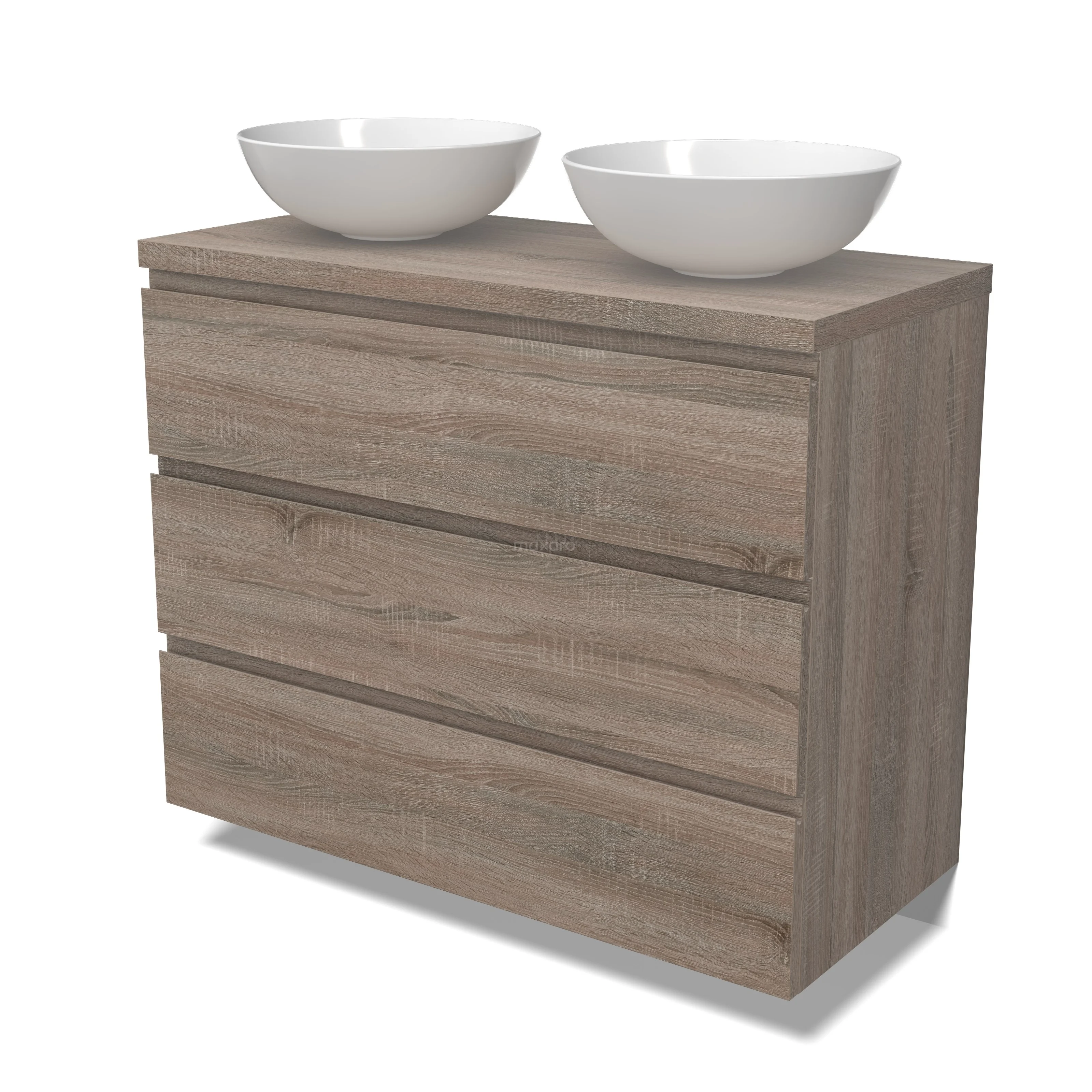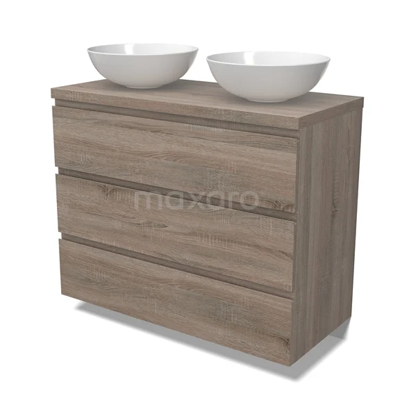 Modulo Plato Badmöbel mit Aufsatzwaschbecken | 100 cm Eiche Grifflos front Eiche blatt 3 Schubladen