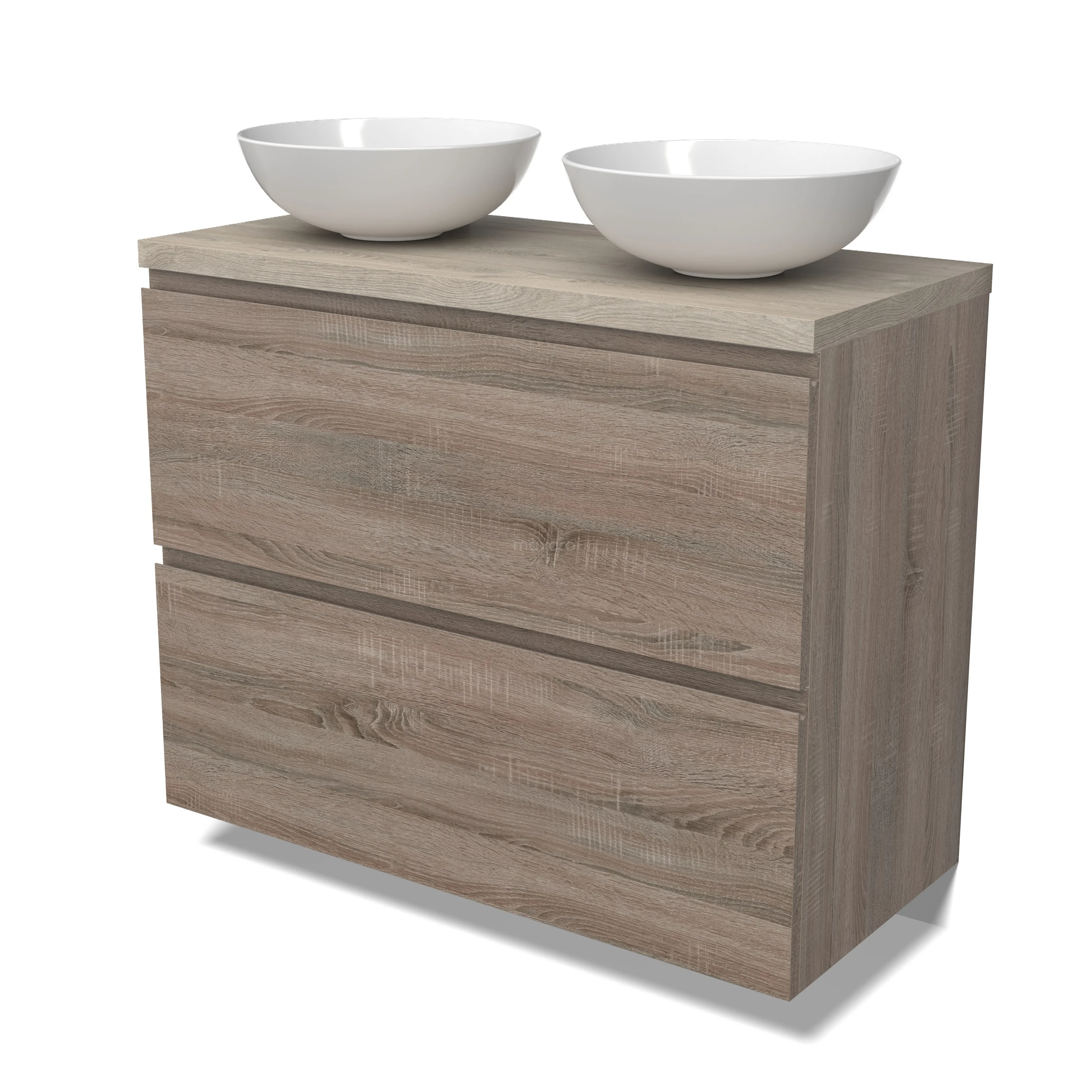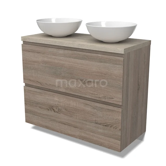 Modulo Plato Badmöbel mit Aufsatzwaschbecken | 100 cm Eiche Grifflos front Hellgraue Eiche blatt 2 hohe Schubladen übereinanderliegend
