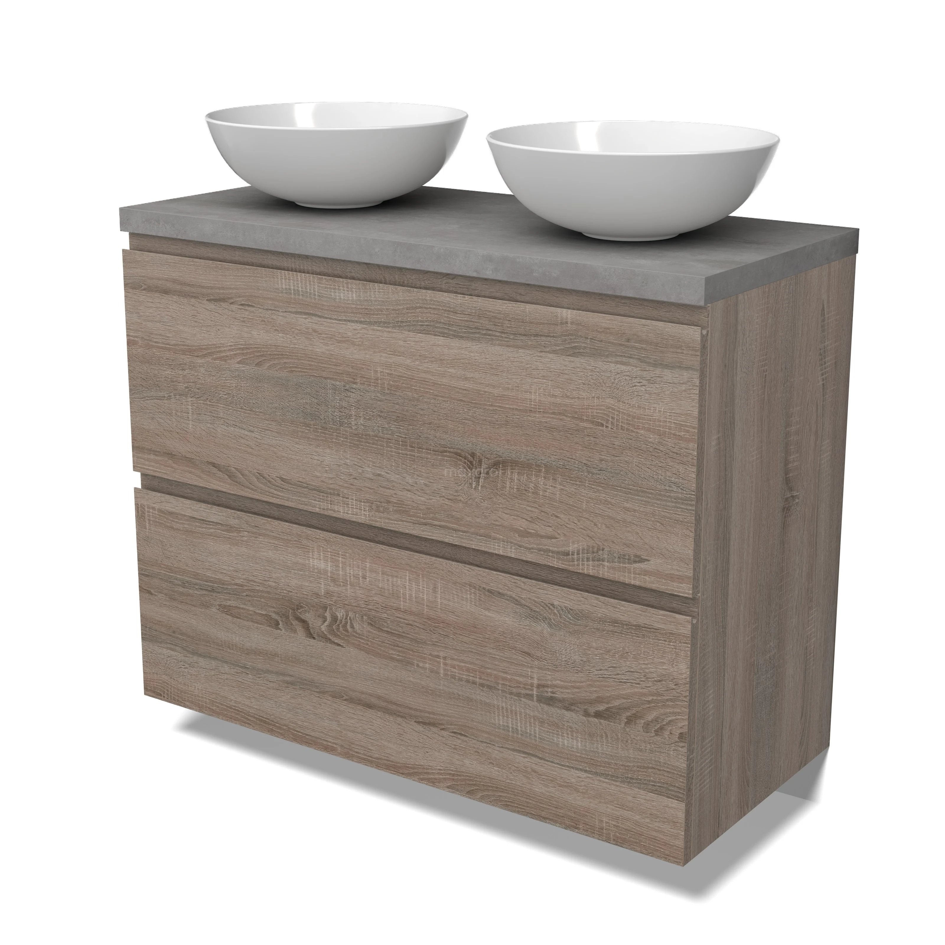 Modulo Plato Badmöbel mit Aufsatzwaschbecken | 100 cm Eiche Grifflos front Hellgrauer Beton blatt 2 hohe Schubladen übereinanderliegend