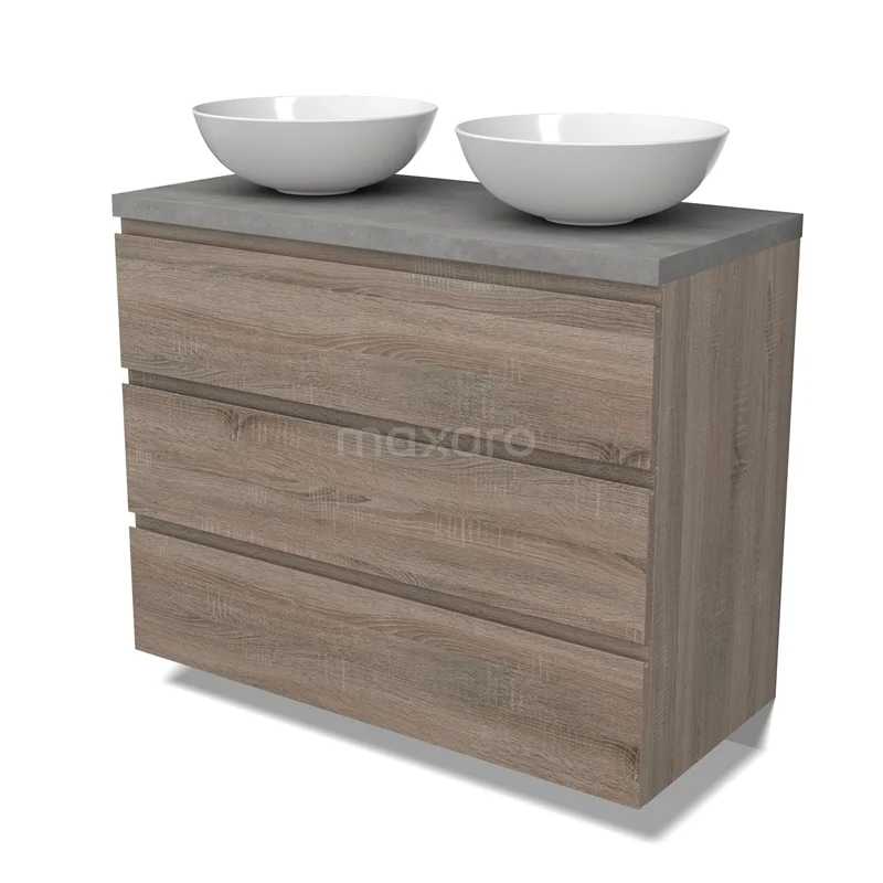 Modulo Plato Badmöbel mit Aufsatzwaschbecken | 100 cm Eiche Grifflos front Hellgrauer Beton blatt 3 Schubladen