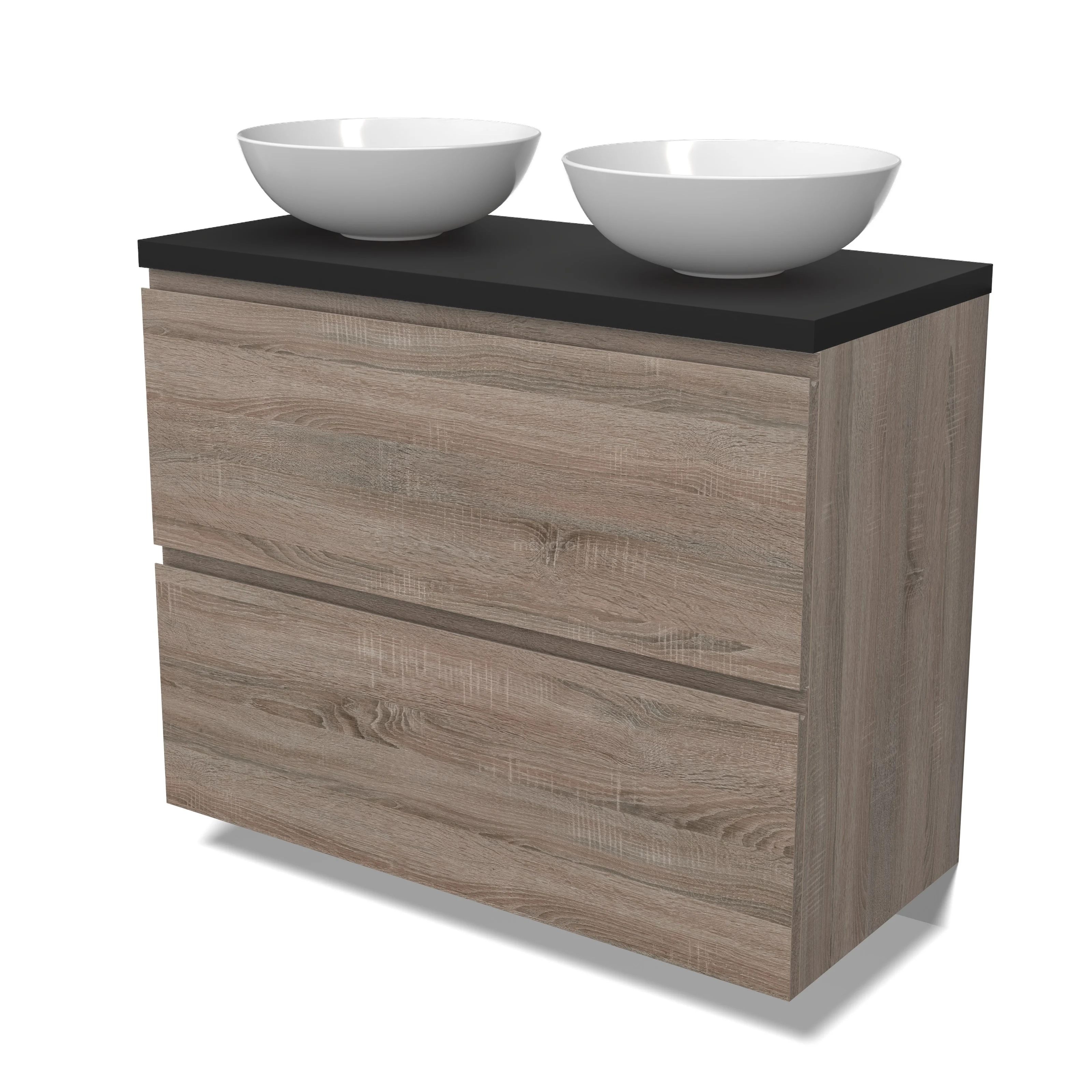 Modulo Plato Badmöbel mit Aufsatzwaschbecken | 100 cm Eiche Grifflos front Matt Schwarz blatt 2 hohe Schubladen übereinanderliegend