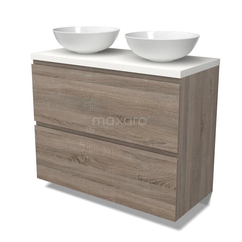 Modulo Plato Badmöbel mit Aufsatzwaschbecken | 100 cm Eiche Grifflos front Matt Weiß blatt 2 hohe Schubladen übereinanderliegend