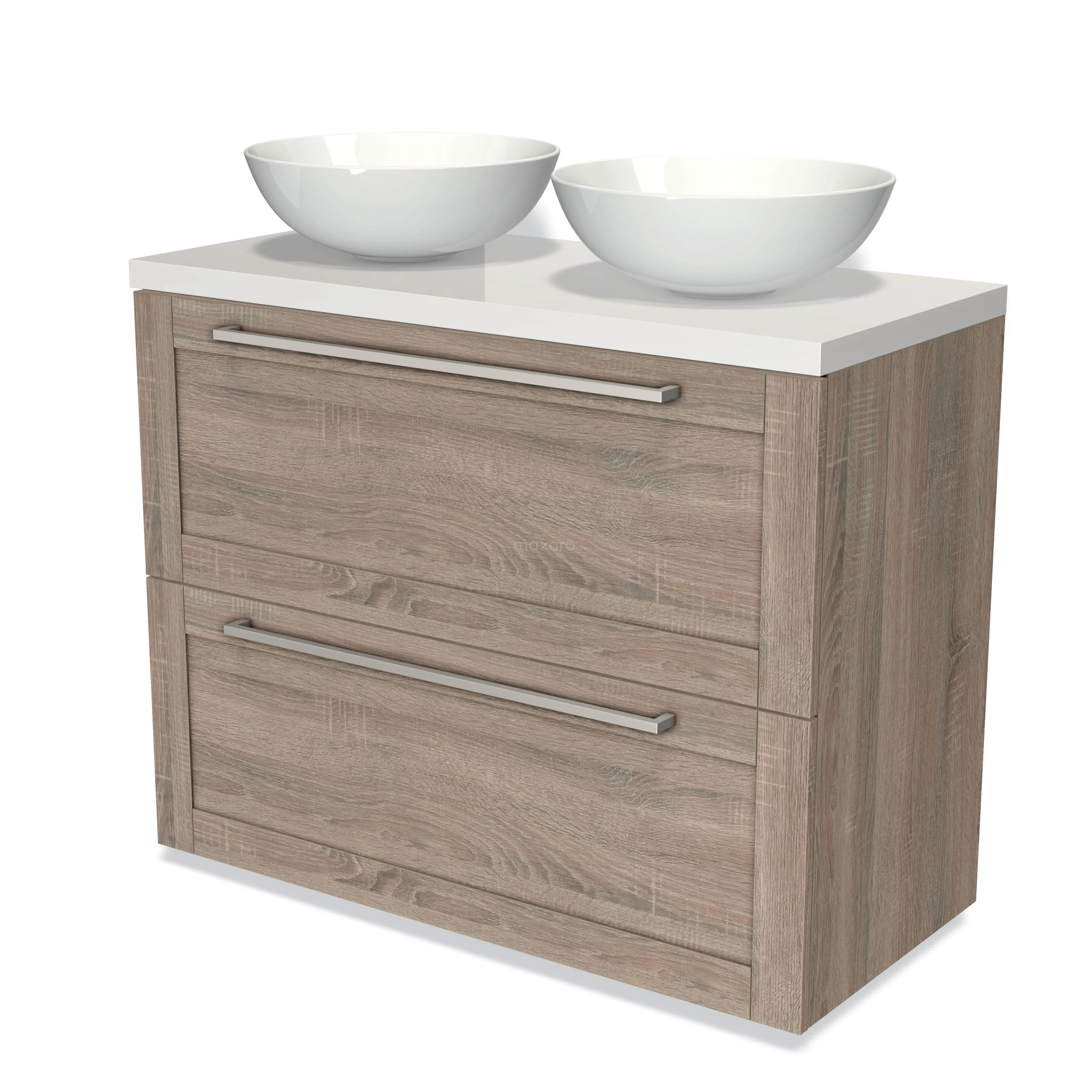 Modulo Plato Badmöbel mit Aufsatzwaschbecken | 100 cm Eiche Rahmen front Hochglanz Weiß blatt 2 hohe Schubladen übereinanderliegend