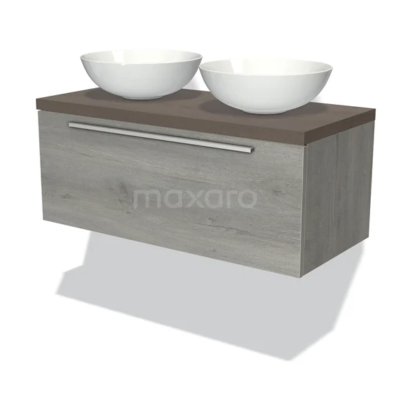 Modulo Plato Badmöbel mit Aufsatzwaschbecken | 100 cm Graue Eiche Flach front Dunkelbraune Eiche blatt 1 Schublade