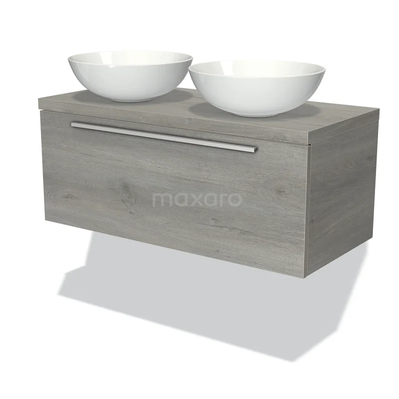 Modulo Plato Badmöbel mit Aufsatzwaschbecken | 100 cm Graue Eiche Flach front Graue Eiche blatt 1 Schublade