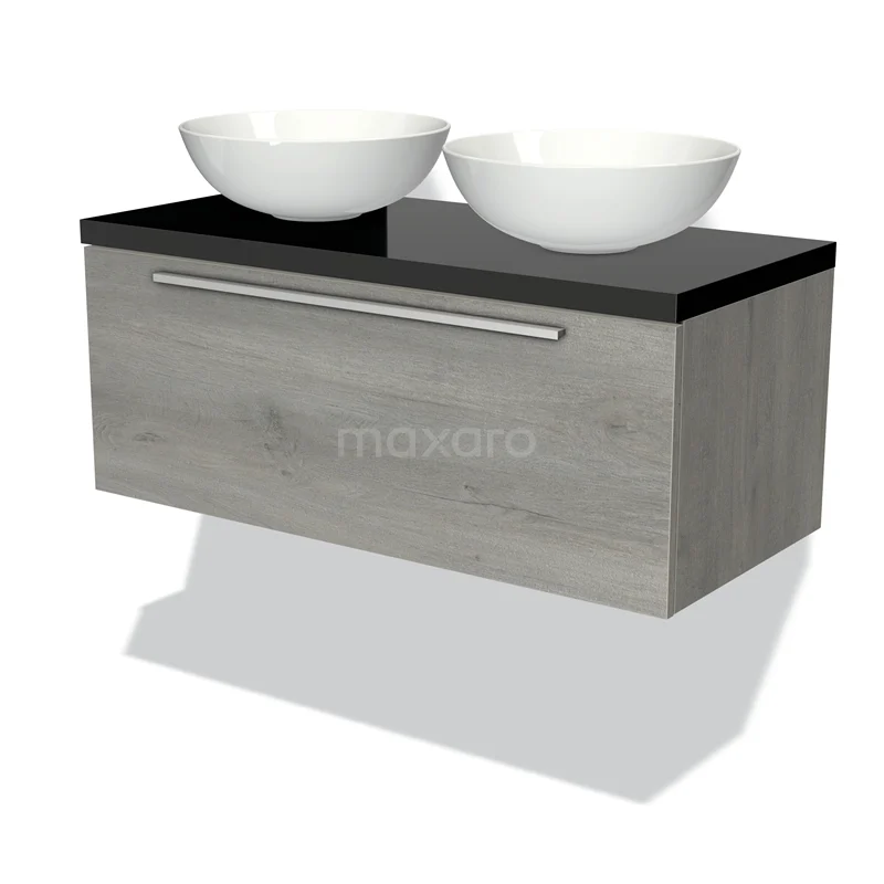 Modulo Plato Badmöbel mit Aufsatzwaschbecken | 100 cm Graue Eiche Flach front Hochglanz Schwarz blatt 1 Schublade