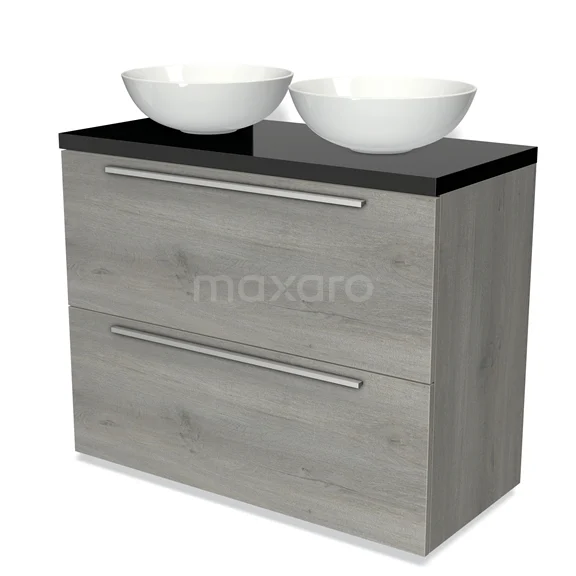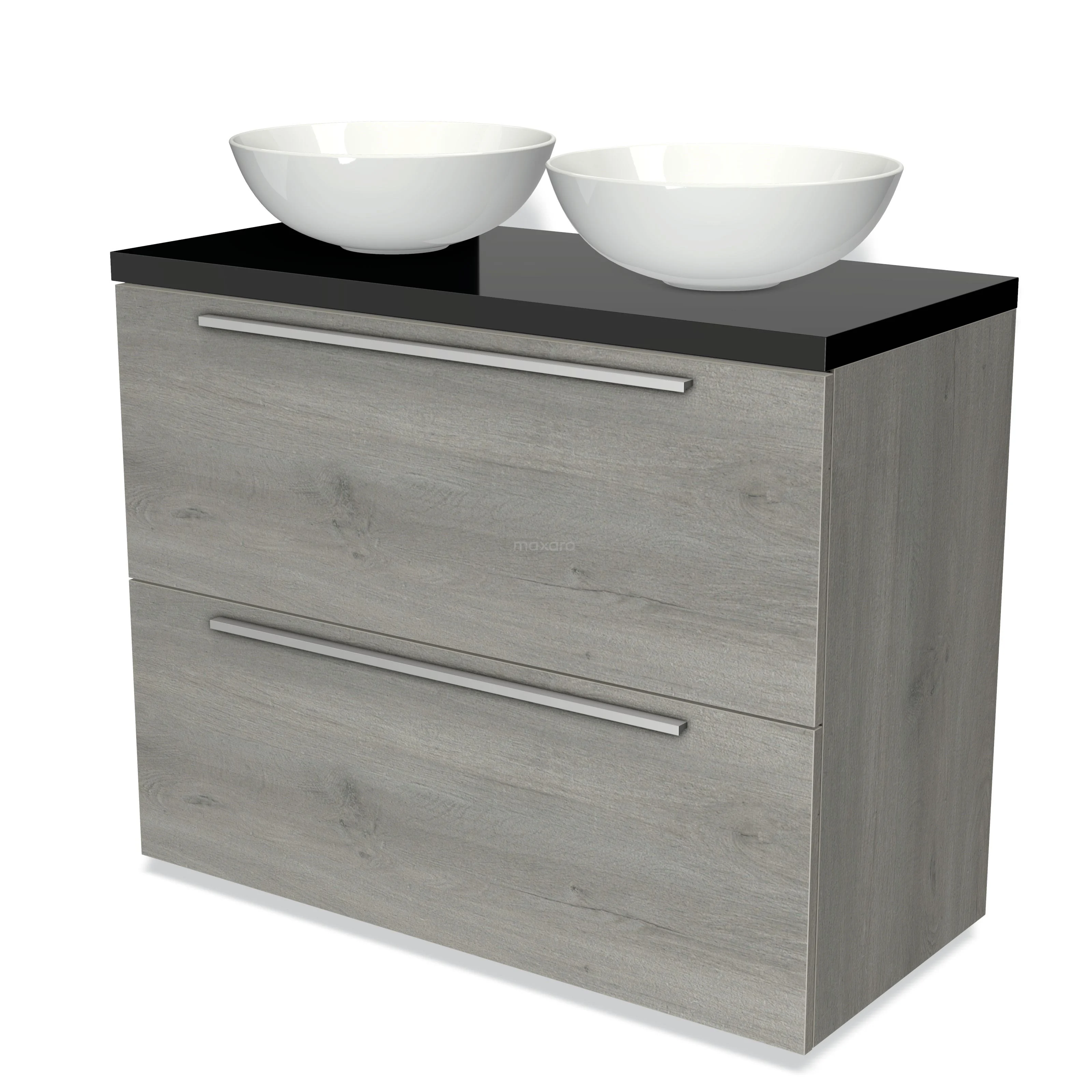 Modulo Plato Badmöbel mit Aufsatzwaschbecken | 100 cm Graue Eiche Flach front Hochglanz Schwarz blatt 2 hohe Schubladen übereinanderliegend