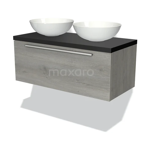 Modulo Plato Badmöbel mit Aufsatzwaschbecken | 100 cm Graue Eiche Flach front Matt Schwarz blatt 1 Schublade