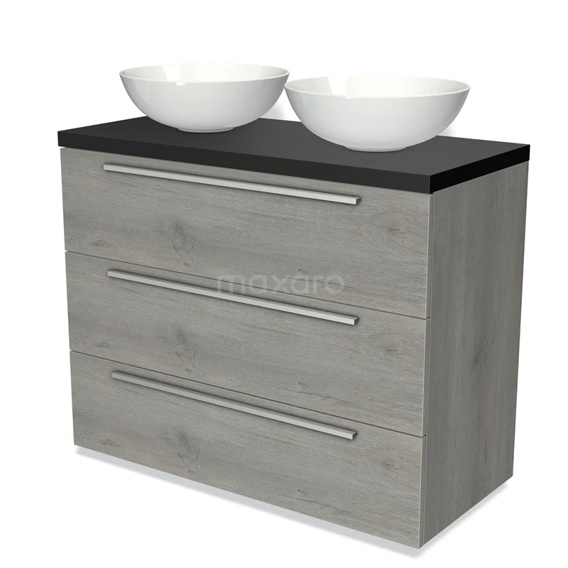 Modulo Plato Badmöbel mit Aufsatzwaschbecken | 100 cm Graue Eiche Flach front Matt Schwarz blatt 3 Schubladen