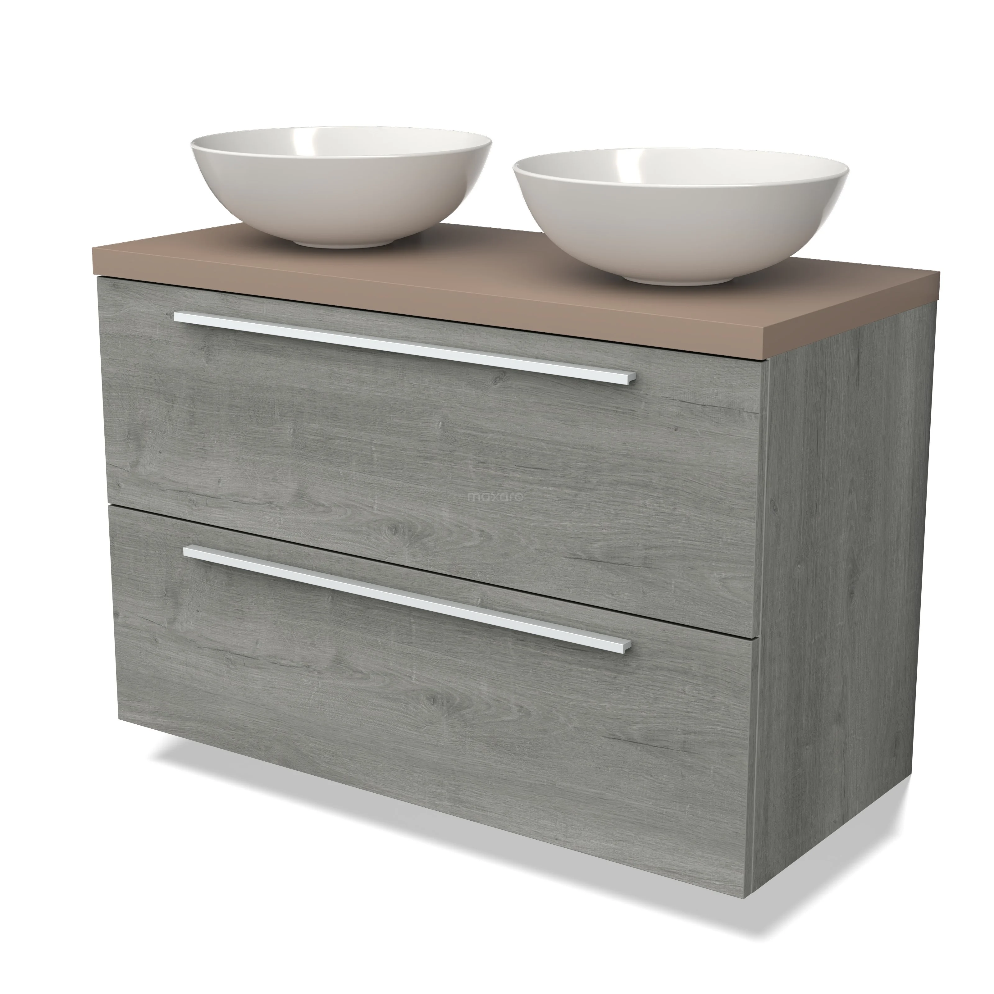 Modulo Plato Badmöbel mit Aufsatzwaschbecken | 100 cm Graue Eiche Flach front Taupe blatt 2 übereinanderliegende Schubladen