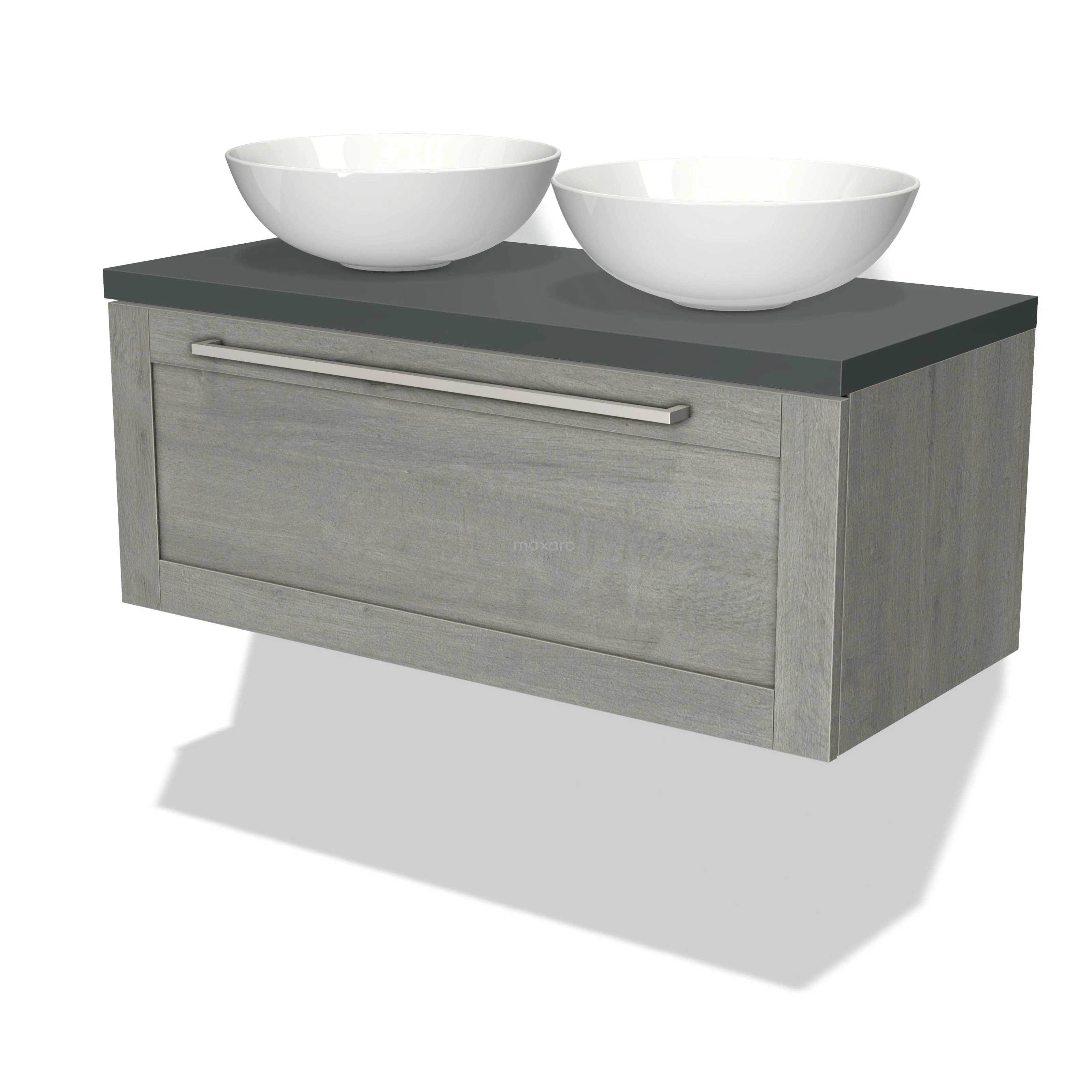 Modulo Plato Badmöbel mit Aufsatzwaschbecken | 100 cm Graue Eiche Rahmen front Dunkelgrau blatt 1 Schublade