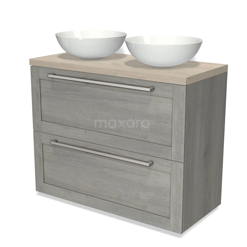 Modulo Plato Badmöbel mit Aufsatzwaschbecken | 100 cm Graue Eiche Rahmen front Hellgraue Eiche blatt 2 hohe Schubladen übereinanderliegend