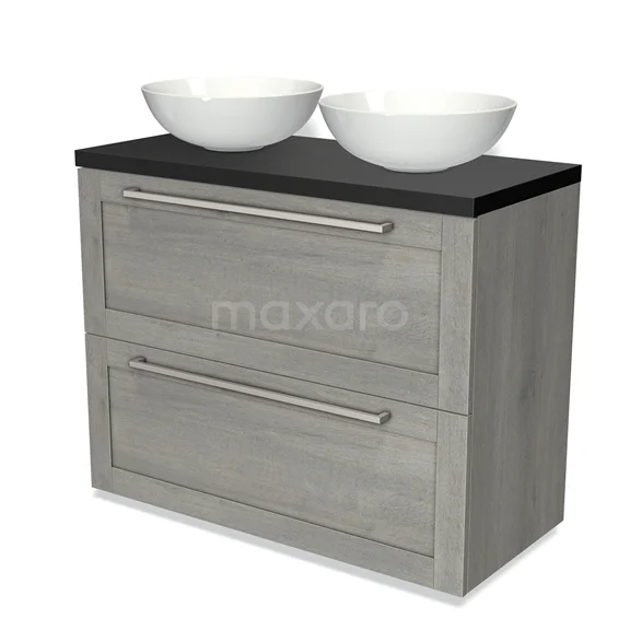 Modulo Plato Badmöbel mit Aufsatzwaschbecken | 100 cm Graue Eiche Rahmen front Matt Schwarz blatt 2 hohe Schubladen übereinanderliegend