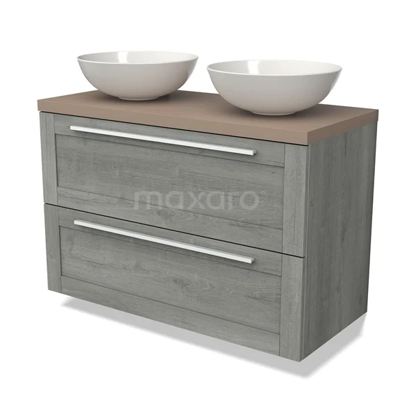 Modulo Plato Badmöbel mit Aufsatzwaschbecken | 100 cm Graue Eiche Rahmen front Taupe blatt 2 übereinanderliegende Schubladen