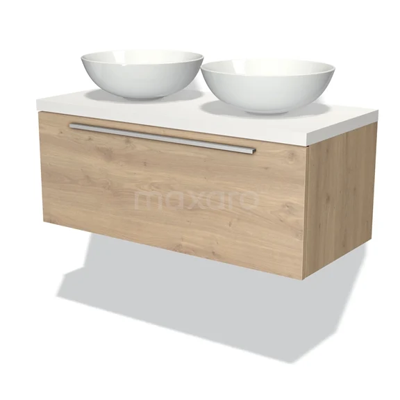 Modulo Plato Badmöbel mit Aufsatzwaschbecken | 100 cm Hellbraune Eiche Flach front Matt Weiß blatt 1 Schublade