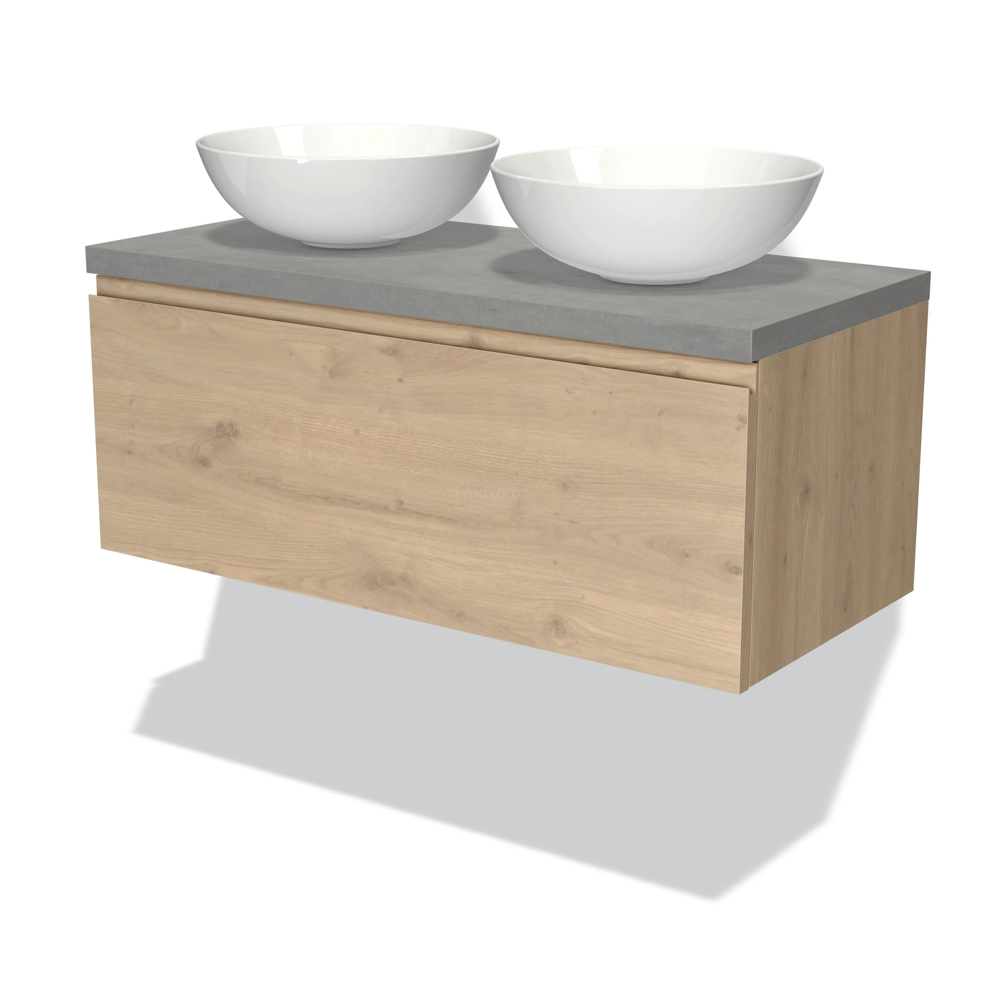 Modulo Plato Badmöbel mit Aufsatzwaschbecken | 100 cm Hellbraune Eiche Grifflos front Hellgrauer Beton blatt 1 Schublade