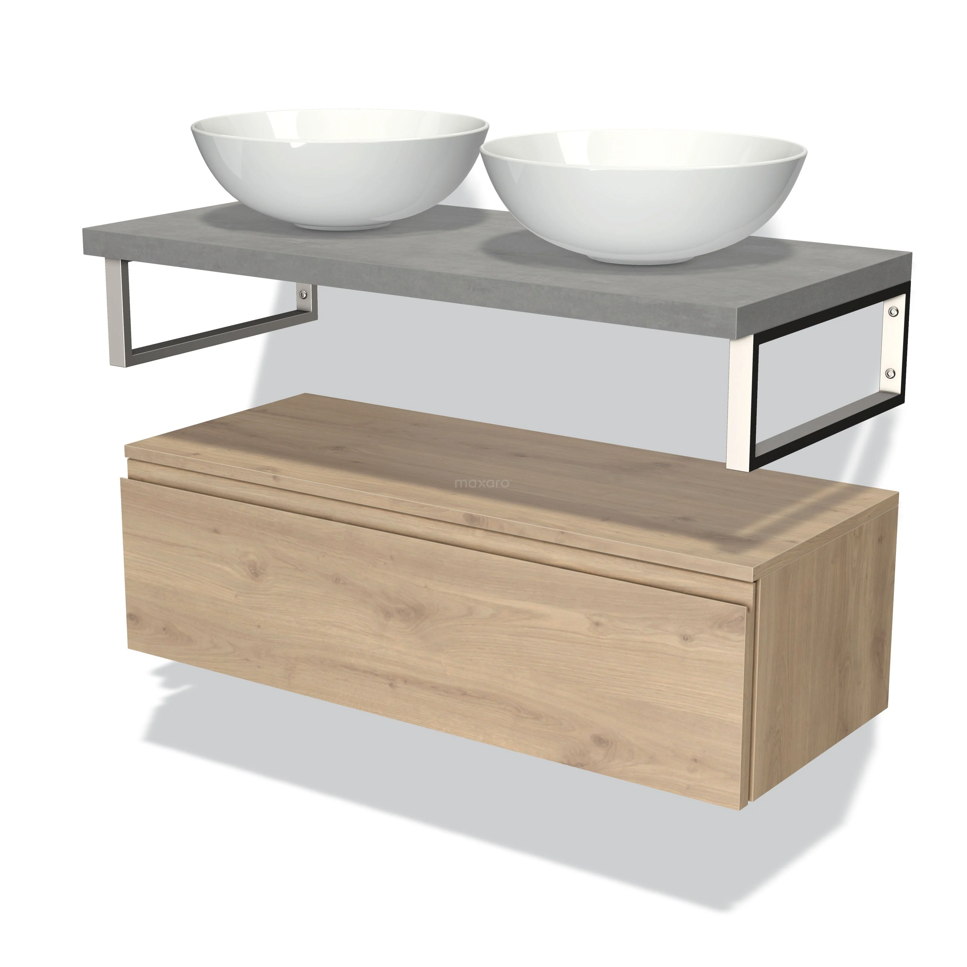 Modulo Plato Badmöbel mit Aufsatzwaschbecken | 100 cm Hellbraune Eiche Grifflos front Hellgrauer Beton blatt Tief hängend