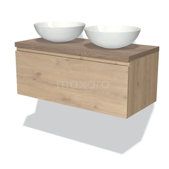 Modulo Plato Badmöbel mit Aufsatzwaschbecken | 100 cm Hellbraune Eiche Grifflos front Mittelbraune Eiche blatt 1 Schublade