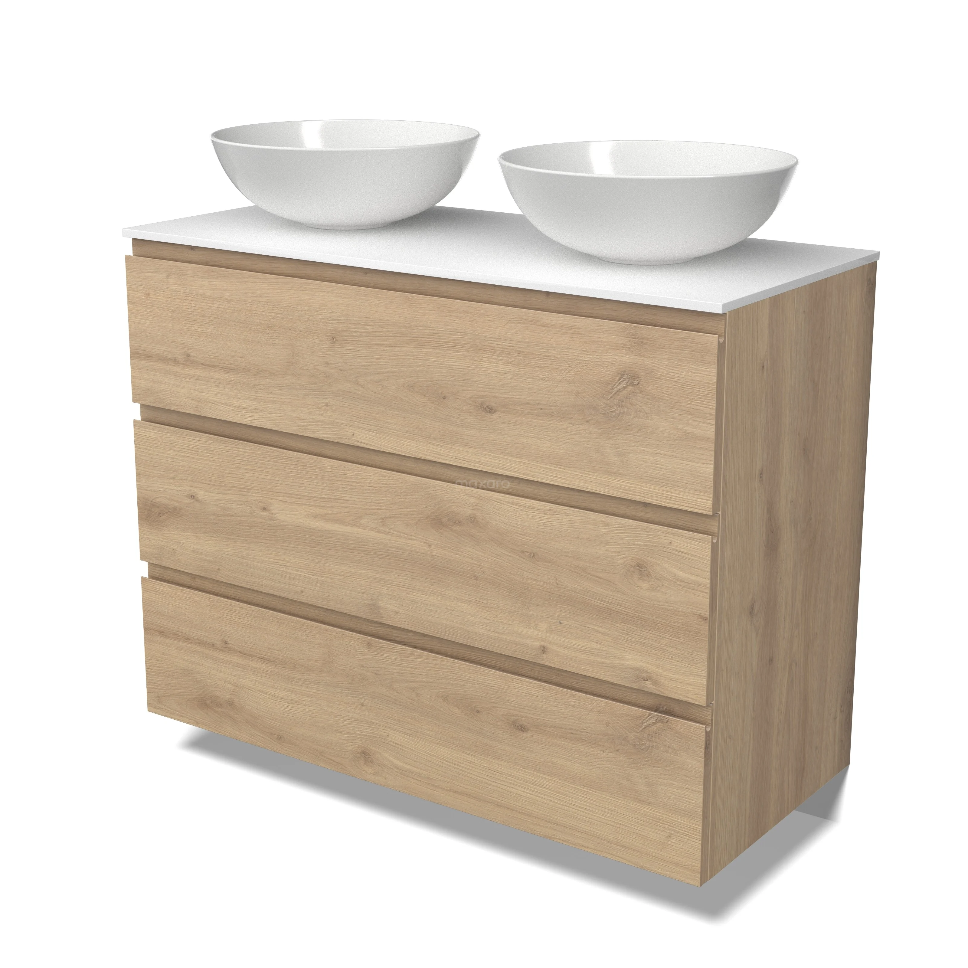 Modulo Plato Badmöbel mit Aufsatzwaschbecken | 100 cm Hellbraune Eiche Grifflos front Solid Surface blatt 3 Schubladen