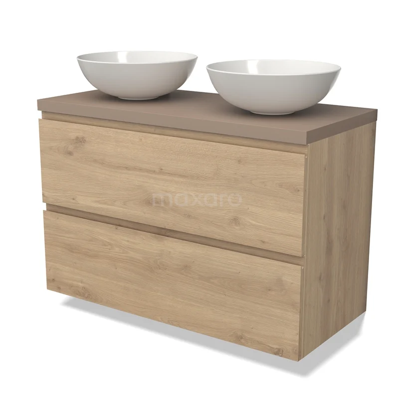 Modulo Plato Badmöbel mit Aufsatzwaschbecken | 100 cm Hellbraune Eiche Grifflos front Taupe blatt 2 übereinanderliegende Schubladen