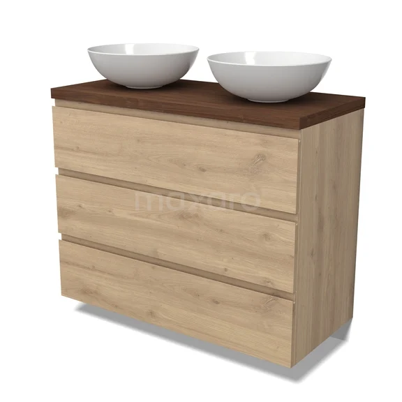 Modulo Plato Badmöbel mit Aufsatzwaschbecken | 100 cm Hellbraune Eiche Grifflos front Walnuss blatt 3 Schubladen