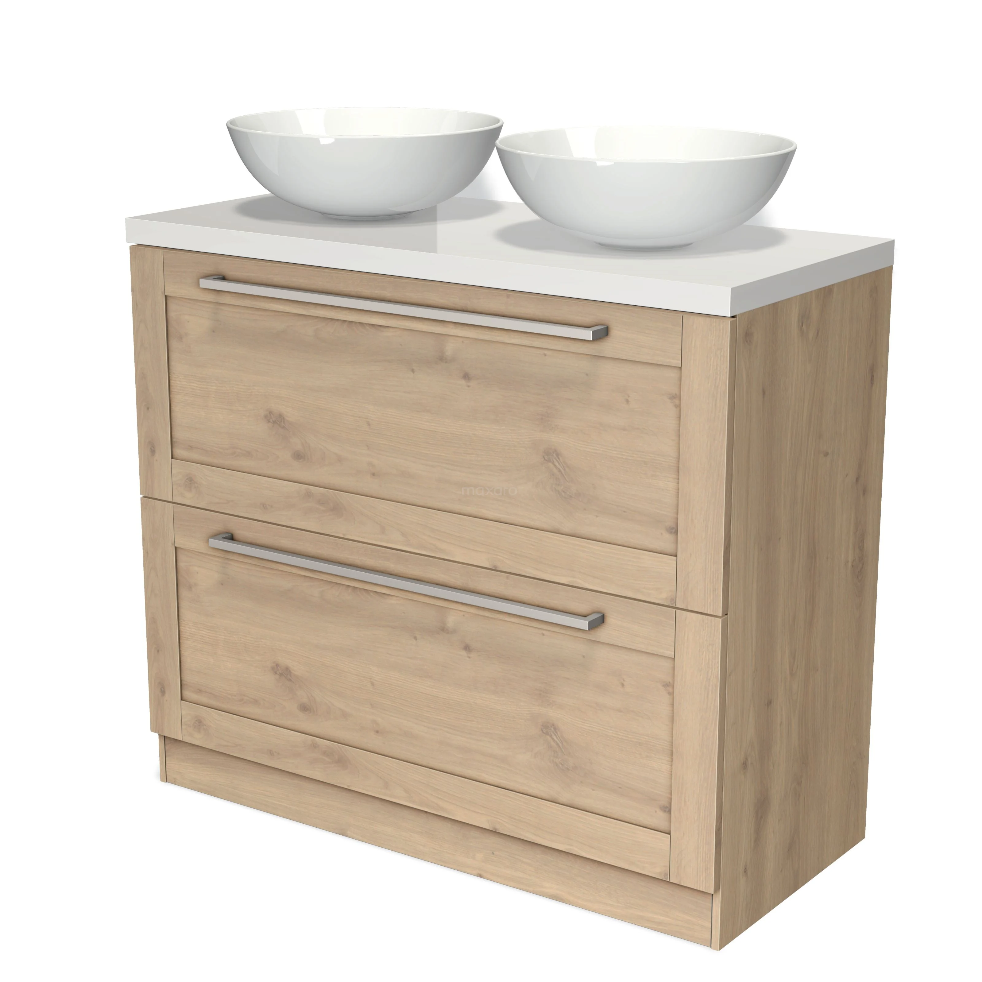 Modulo Plato Badmöbel mit Aufsatzwaschbecken | 100 cm Hellbraune Eiche Rahmen front Hochglanz Weiß blatt 2 hohe Schubladen übereinanderliegend