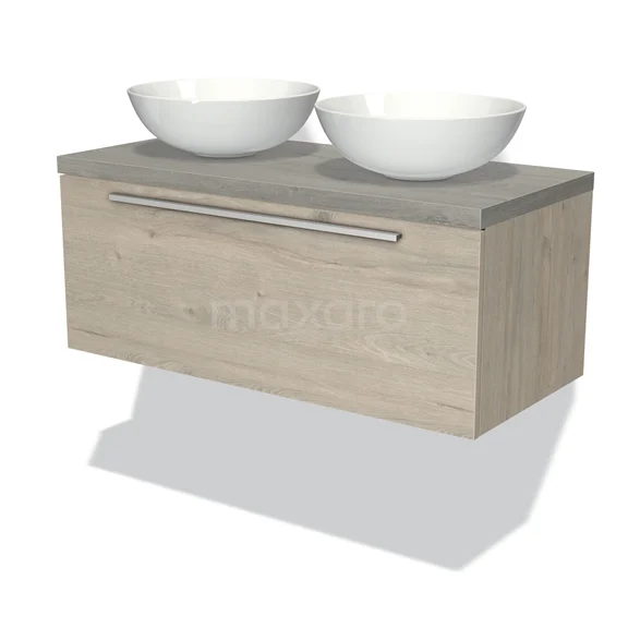 Modulo Plato Badmöbel mit Aufsatzwaschbecken | 100 cm Hellgraue Eiche Flach front Graue Eiche blatt 1 Schublade