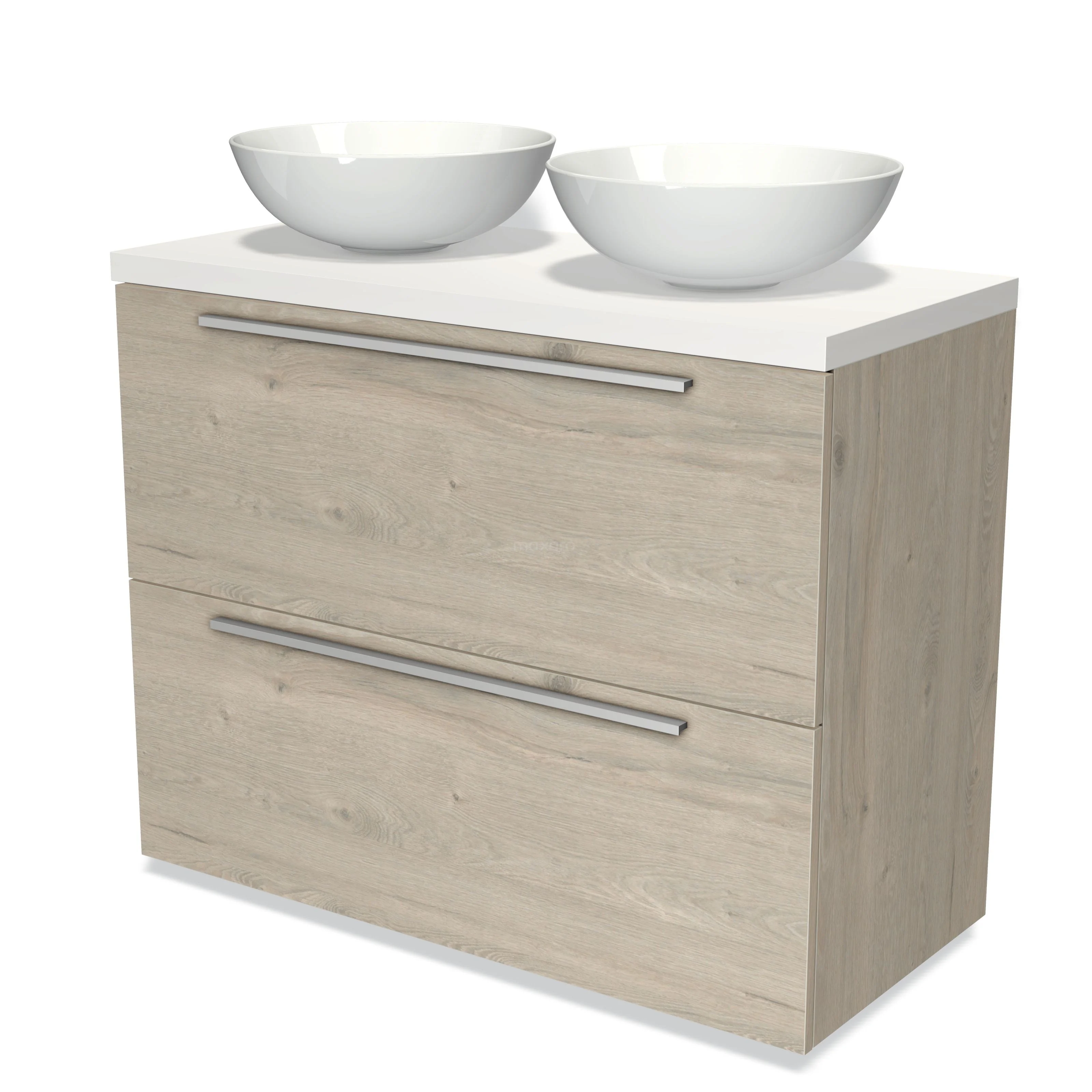 Modulo Plato Badmöbel mit Aufsatzwaschbecken | 100 cm Hellgraue Eiche Flach front Matt Weiß blatt 2 hohe Schubladen übereinanderliegend